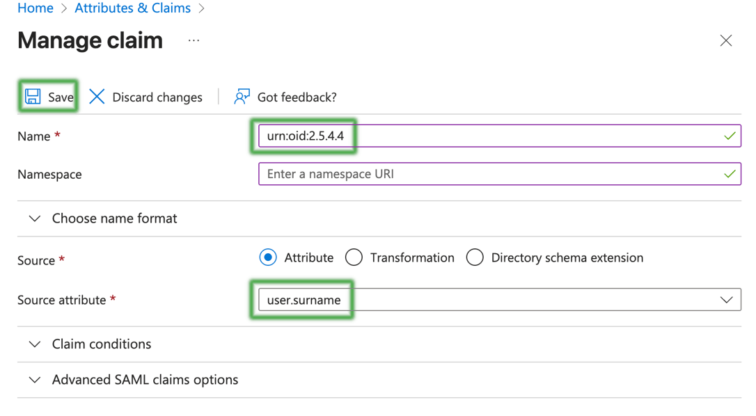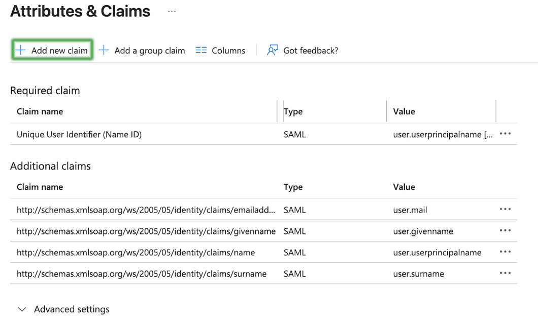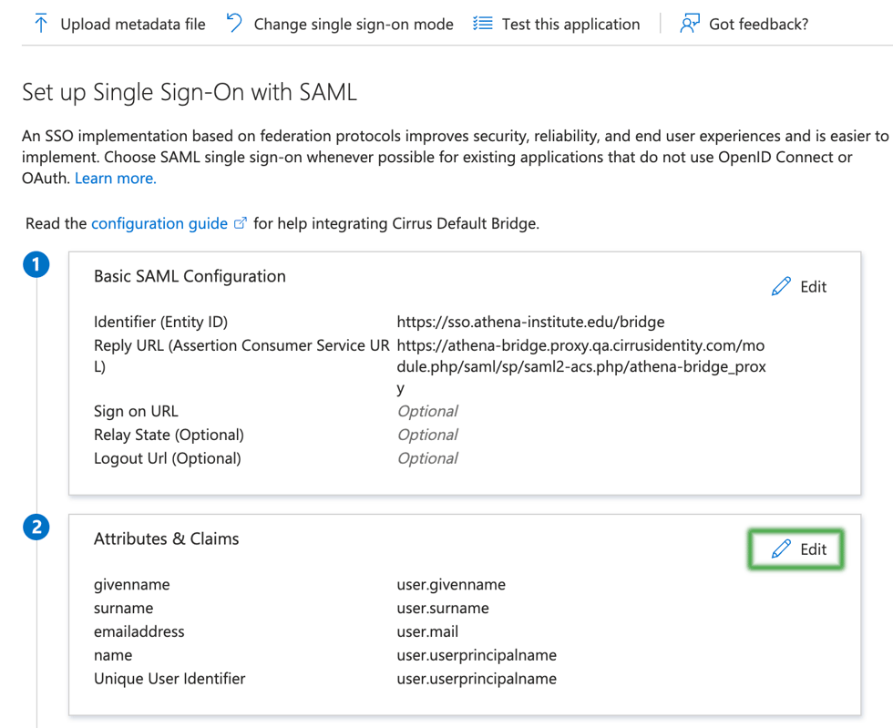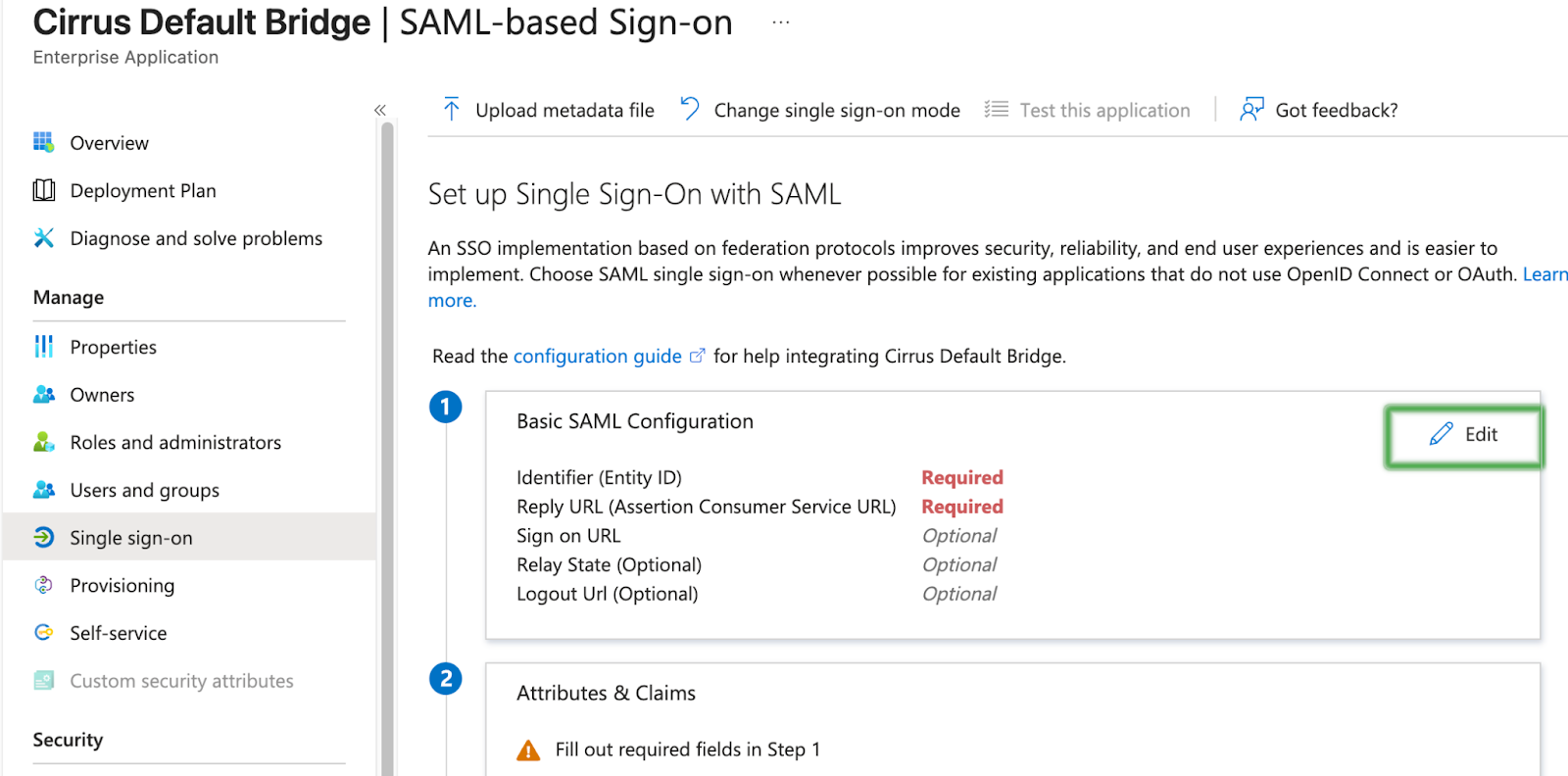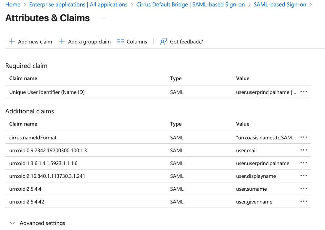 Next, the attributes will be configured. Entra ID calls them claims. Entra ID also allows you to perform transformations to your attributes. Please refer to the list you created from the Authentication Profiles for Cirrus Bridge page to configure these attributes.