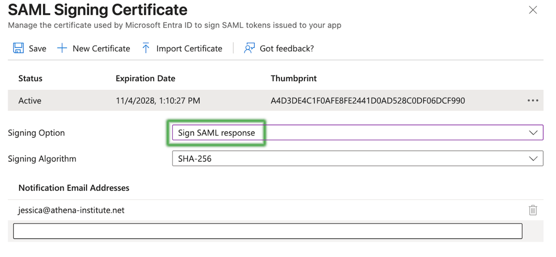 Entra ID signs both the SAML response and assertion. Some applications only want one or the other signed. Our recommendation for the default application is to only sign the response. This configuration will match Shibboleth’s default behavior.