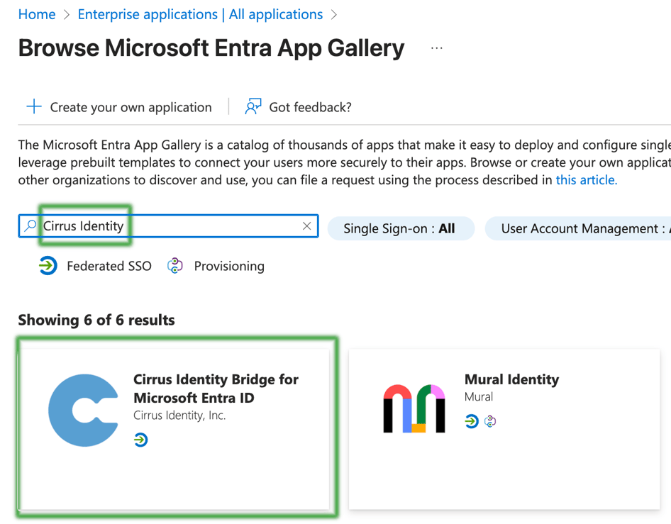 In the search box, search for “Cirrus Identity” and select the “Cirrus Identity Bridge for Microsoft Entra ID” gallery app.