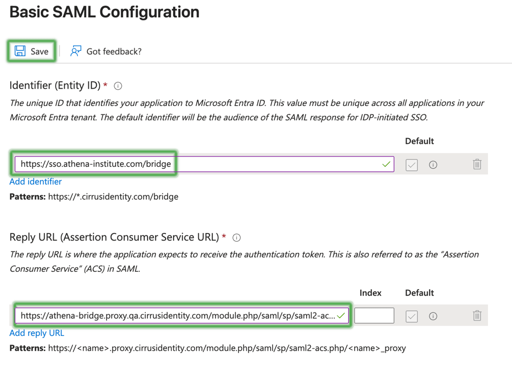 Additionally, each unique authentication profile requires its own Entra ID application. An authentication profile includes the NameID format and value, set of attributes, and set of signing and encryption settings. A typical implementation will include the default profile(s) for each protocol, and then one or more additional profiles if required by the service providers. Your Cirrus Implementation Lead will work with you to develop these additional profiles and provide support for configuration. Entra ID allows you to add multiple Entity IDs and/or Entity Categories to a single application.