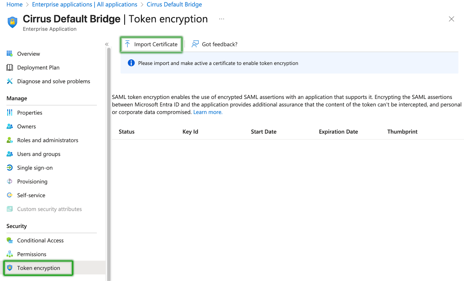 Customers moving from Shibboleth likely have a default policy to encrypt all assertions. To enable this, navigate to the “Token Encryption” side menu, import the certificate for the Cirrus Bridge, and then activate the certificate. It can take several minutes for Azure AD to start encrypting assertions.