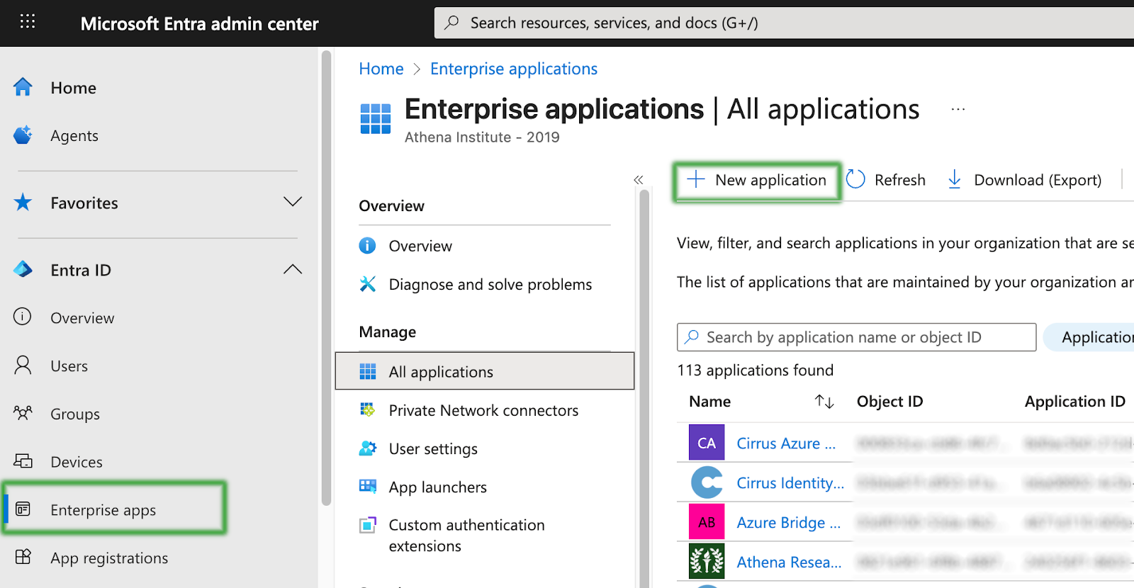 Log into the Entra ID portal https://entra.microsoft.com, click the “Enterprise applications” left menu item, and then click “New application”.