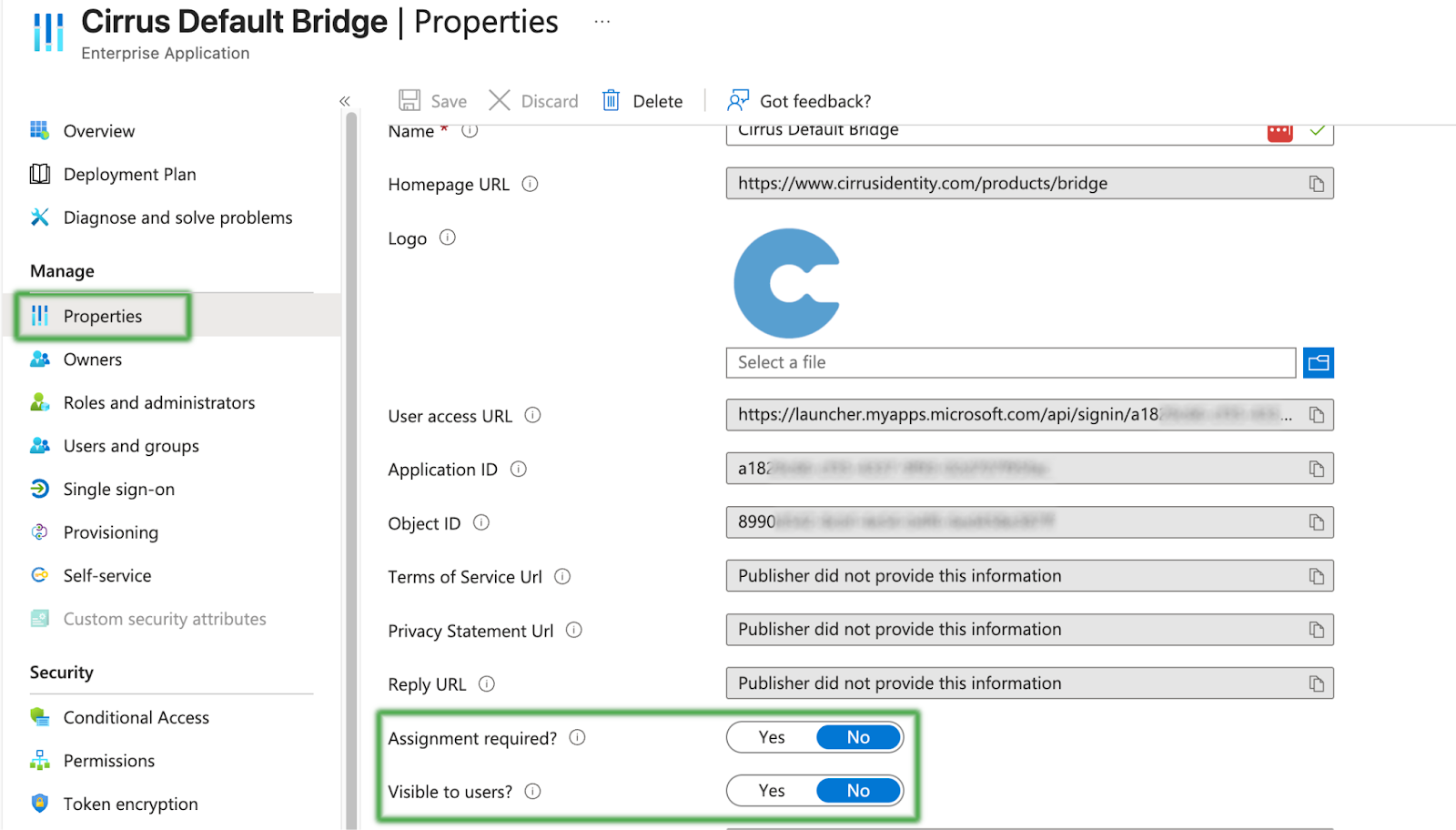By default Cirrus recommends that you set Assignment Required? and Application Visibility? to No.