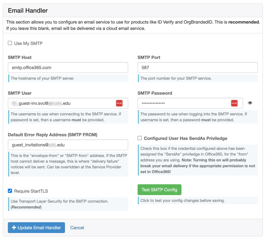When a configuration is complete and testing is successful, check the box for “Use My SMTP” at the top to enable it.